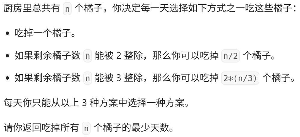 class Solution:@cachedef minDays(self, n: int) -> int:if n<=1:return nreturn min(n%2+1+self.minDays(n//2), n%3+1+self.minDays(n//3))