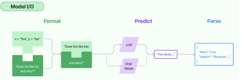 所谓的Model I/O,包括输入提示(Format)、调用模型(Predict)、输出解析(Parse)。分别对应着 Prompt Template , Model 和 Output Parser 。 简单来说,就是输⼊、模型处理、输出这三个步骤。