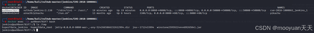 cve-2018-1000861_jenkins_1: 你可以用这个名字来操作它,比如进入容器看看攻击是否成功:docker exec -it cve-2018-1000861_jenkins_1 ls /tmp,检查是否创建了success文件。