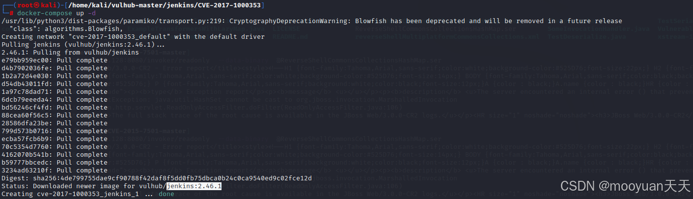 在CVE-2018-1000861目录下,使用docker-compose up -d命令启动环境。Vulhub 的脚本会自动从 Docker Hub 拉取预先构建好的镜像并启动容器。