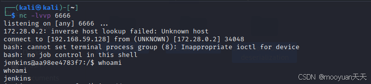 此时查看kali攻击机的监听,已经成功连接,输入whoami返回正确结果,渗透成功。