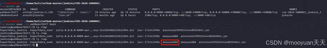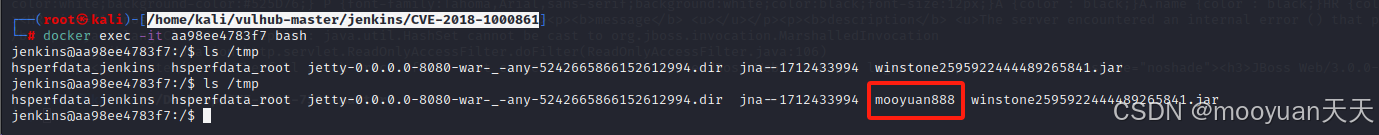 我们尝试执行一个命令,例如 touch /tmp/mooyuan888。如果成功,会在目标服务器的 /tmp 目录下创建一个名为mooyuan888的文件,这是漏洞利用成功的标志。我们先进入容器,查看下/tmp下文件,如下所示不存在mooyuan888这个文件。