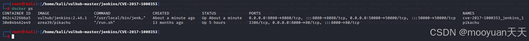 aa98ee4783f7 vulhub/jenkins:2.138 "/sbin/tini -- /usr/…" 9 minutes ago Up 9 minutes 0.0.0.0:8080->8080/tcp, :::8080->8080/tcp, 0.0.0.0:50000->50000/tcp, :::50000->50000/tcp cve-2018-1000861_jenkins_1