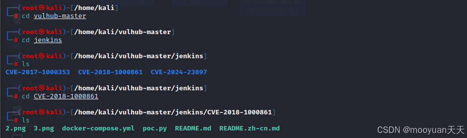 Vulhub 已经准备好现成的漏洞环境,我们只需进入对应目录。注意:docker需要管理员权限运行,故而注意需要切换到root执行后续的docker命令。
