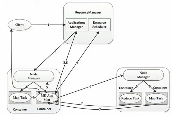 7.任务运行中,会向ApplicationsMaster报告进度和状态,ApplicationsMaster持续监控所有任务,如果一个任务失败,它会重新向RM申请资源,然后在新的Container中重新运行该任务;
