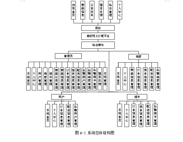 为了更好的去理清本系统整体思路,对该系统以结构图的形式表达出来,设计实现该高校网上订餐平台的功能结构图如下所示: