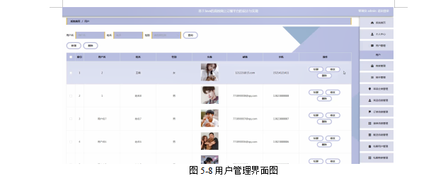 管理员点击用户管理;在用户管理页面对用户名、姓名、性别、头像、邮箱、手机等信息,进行查询,新增或删除用户信息等操作;如图5-8所示。