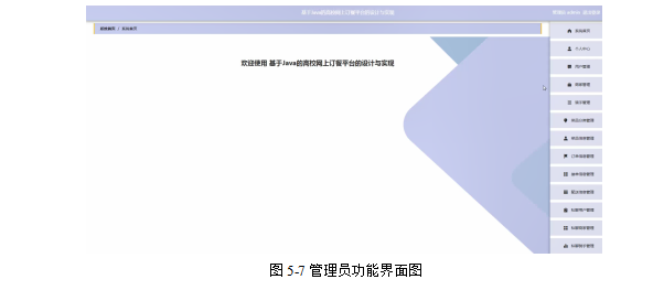 管理员登录进入高校网上订餐平台的实现可以查看系统首页、个人中心、用户管理、商家管理、骑手管理、菜品分类管理、菜品信息管理、订单信息管理、接单信息管理、配送信息管理、私聊用户管理、私聊商家管理、私聊骑手管理、留言反馈、系统管理等信息,如图5-7所示。