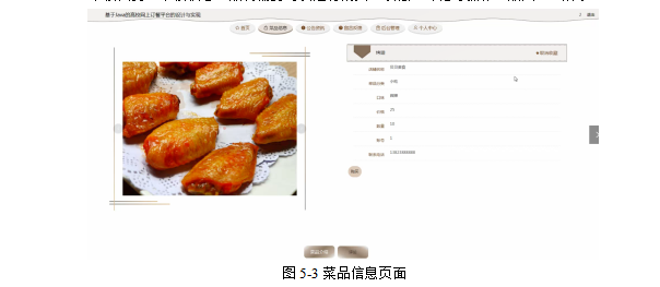 用户点击菜品信息,在菜品信息页面的搜索栏输入店铺名称、菜品名称,进行查询,然后查看店铺名称、菜品名称、菜品分类、图片、口味、价格、数量、联系电话、审核回复、审核状态,如有需要可以进行购买、收藏、评论等操作;如图5-3所示: