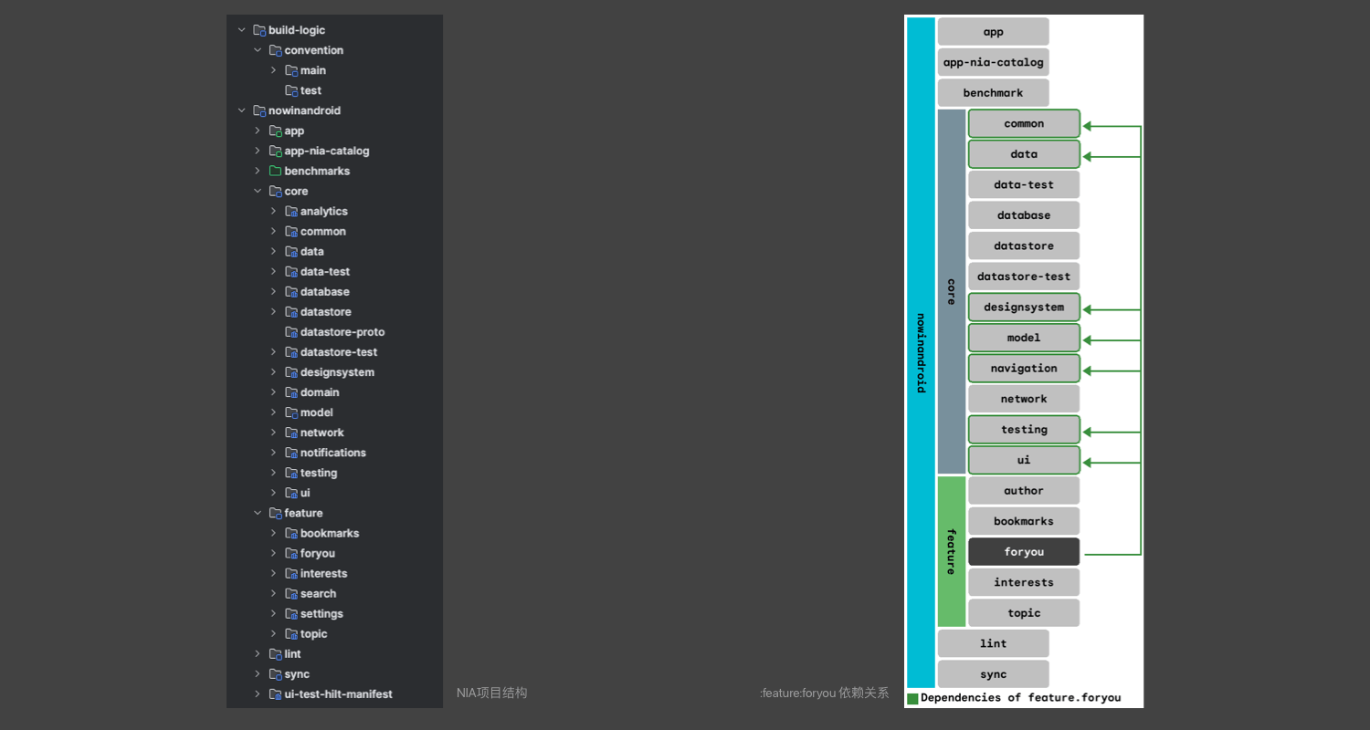 NIA 严格遵循 Android 官方架构指南,采用 数据层(Data)、领域层(Domain)、UI 层(UI) 的分层设计: