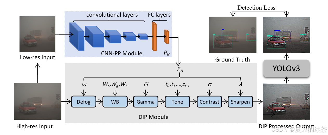 如上图,首先将输入图像resize成256×256的大小,将其输入CNN-PP以预测DIP的参数。然后,将DIP模块过滤后的图像作为YOLOv3检测器的输入。采用这种方式对输入的信息进行图像预处理,这样就能让CNN-PP学习DIP的参数,采用弱监督方式去自适应增强图像以进行目标检测。