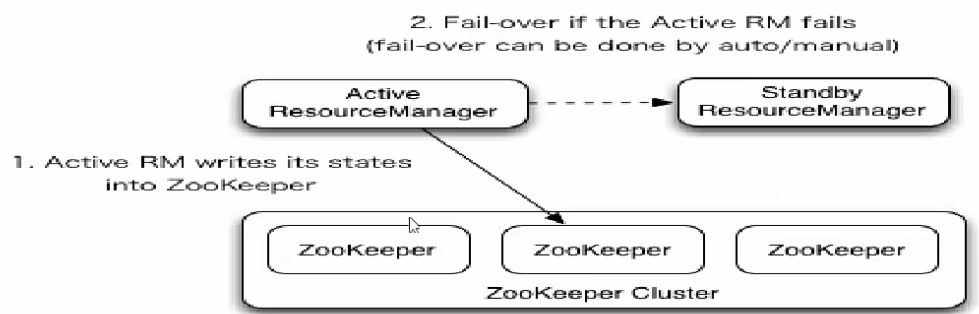 ZooKeeper:用于领导选举和存储YARN集群的状态。多个RM通过竞争,一个成为Active,其余成为Standby