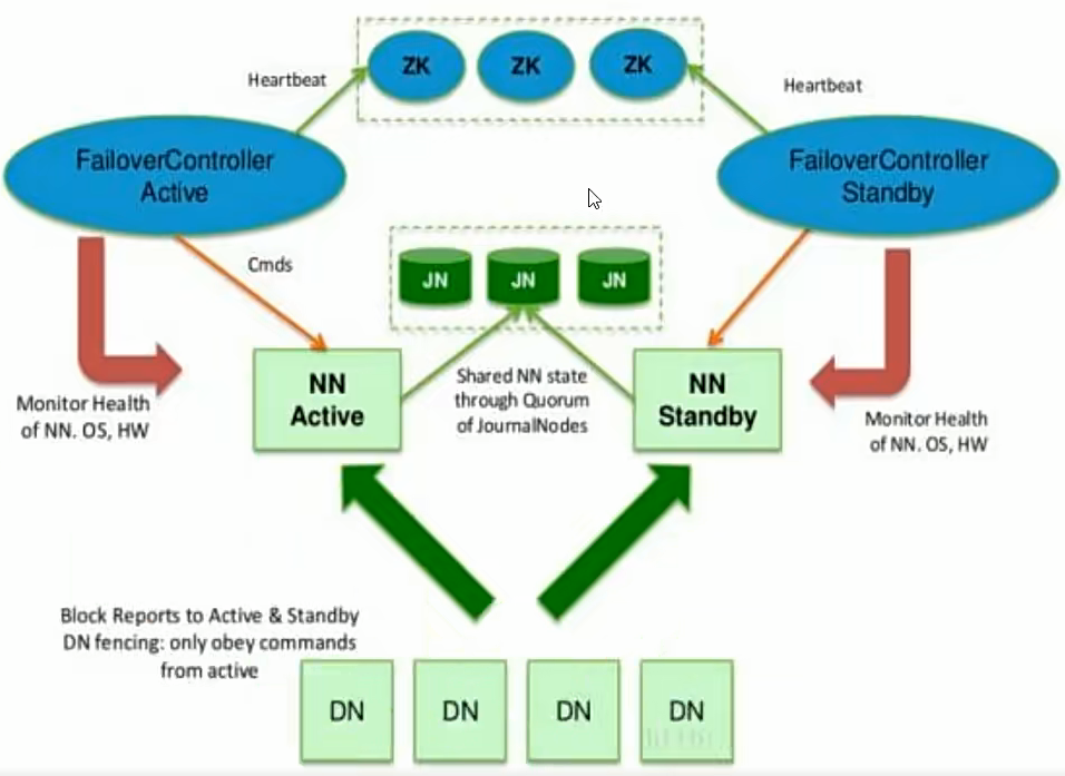 DataNode:所有DataNode通过心跳机制向Active NN和Standby NN发送心跳和块报告,所以数据块存储在哪个DN上不需要同步到共享存储中。