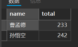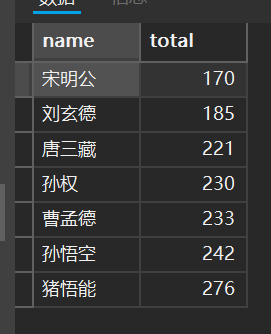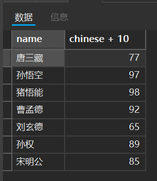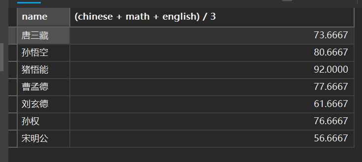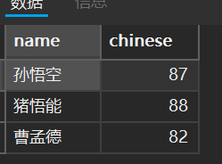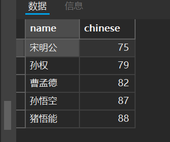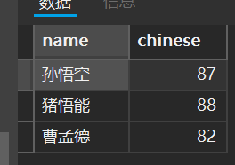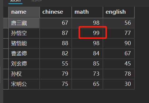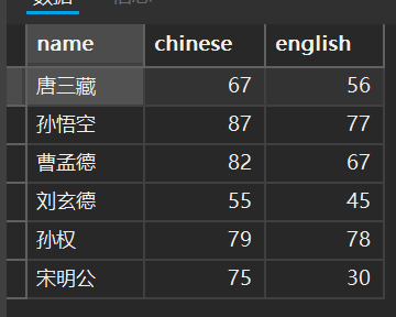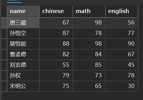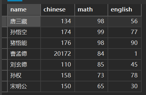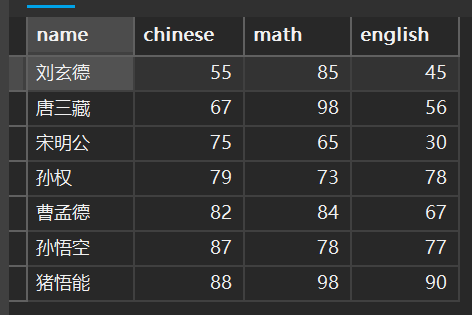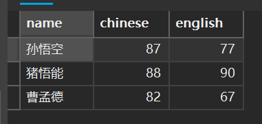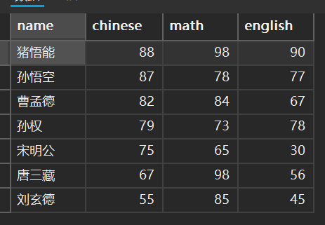 create table grade(name varchar(10), chinese int, math int, english int);insert into grade values('唐三藏', 67, 98, 56), ('孙悟空', 87, 78, 77),('猪悟能', 88, 98, 90), ('曹孟德', 82, 84, 67),