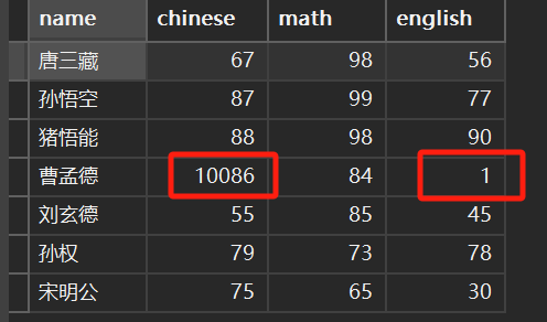 2.)将曹孟德的语文成绩改为10086分,英语成绩改为1分
