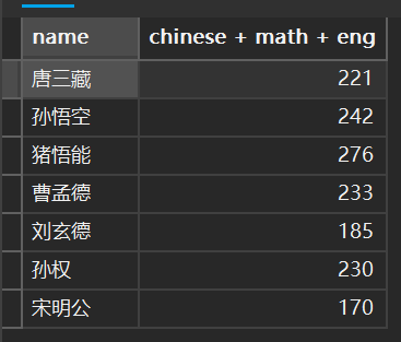select name as '姓名', chinese + math + english as '总成绩' from grade;