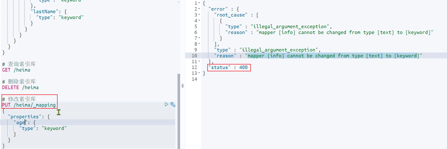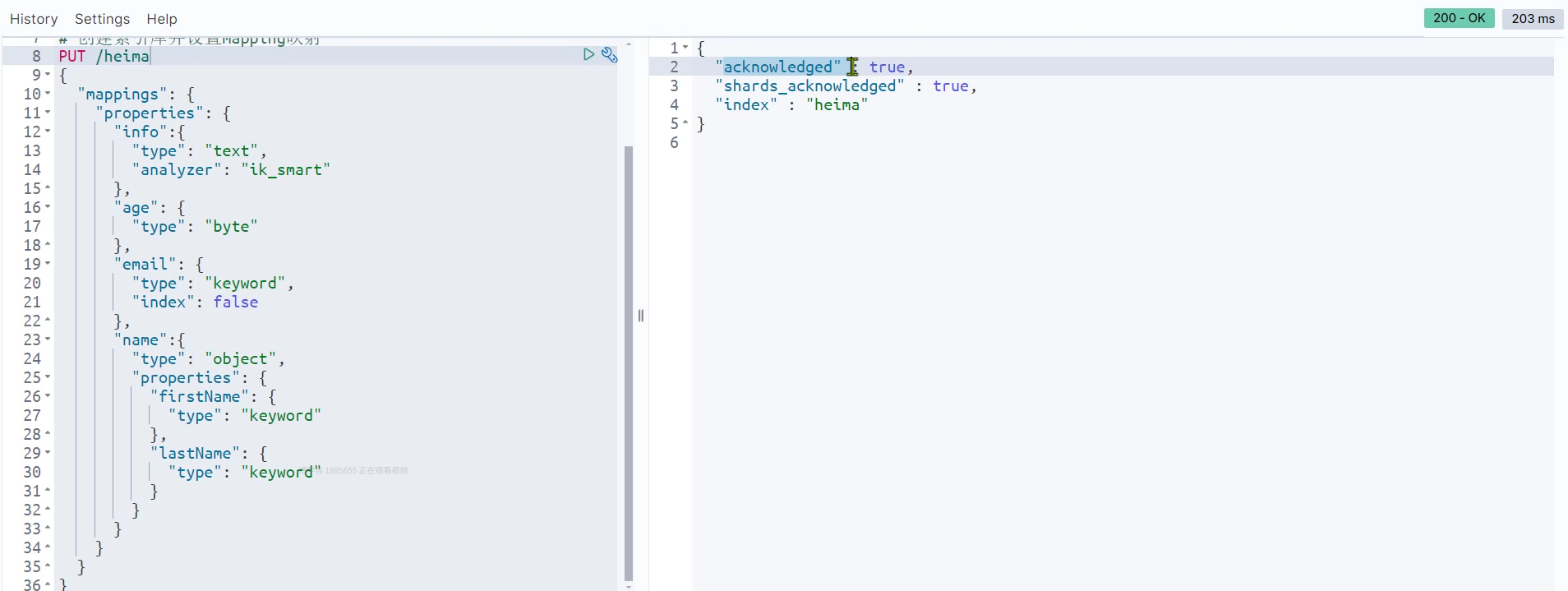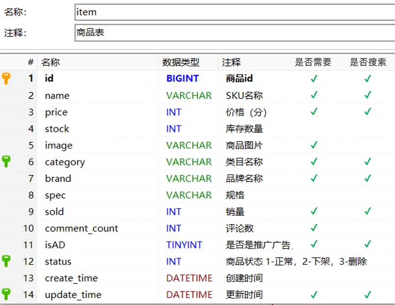 {"mappings": {"properties": {"id": {"type": "keyword"},"name":{"type": "text","analyzer": "ik_smart"},"price":{"type": "integer"},"image":{"type": "keyword","index": false},"category":{"type": "keyword"},"brand":{"type": "keyword"},"sold":{"type": "integer"},"commentCount":{"type": "integer","index": false},"isAD":{"type": "boolean"},"updateTime":{"type": "date"}}}