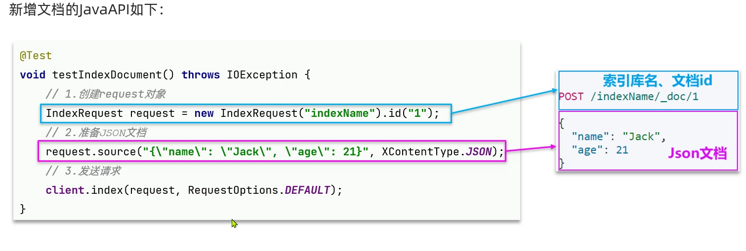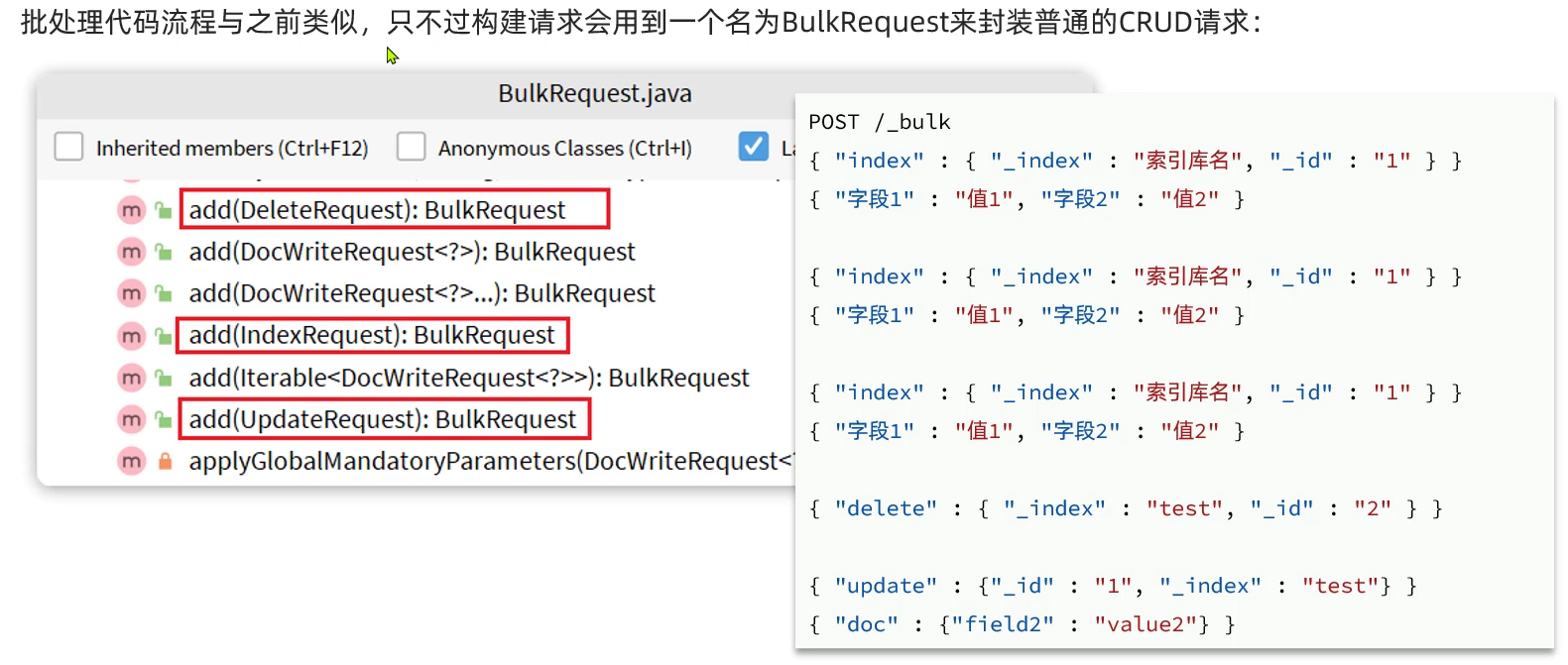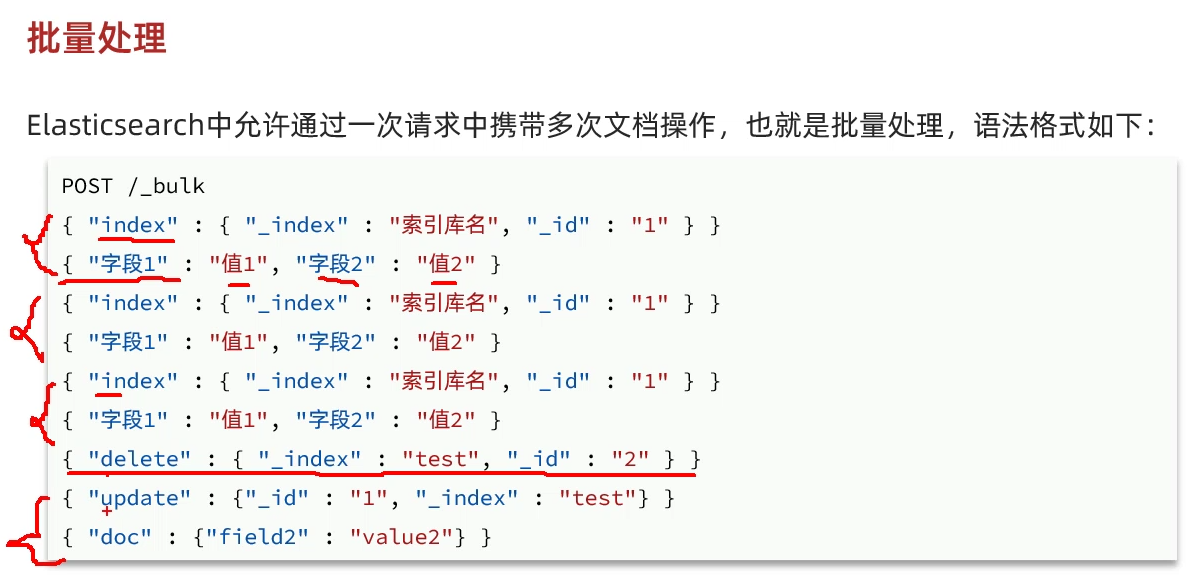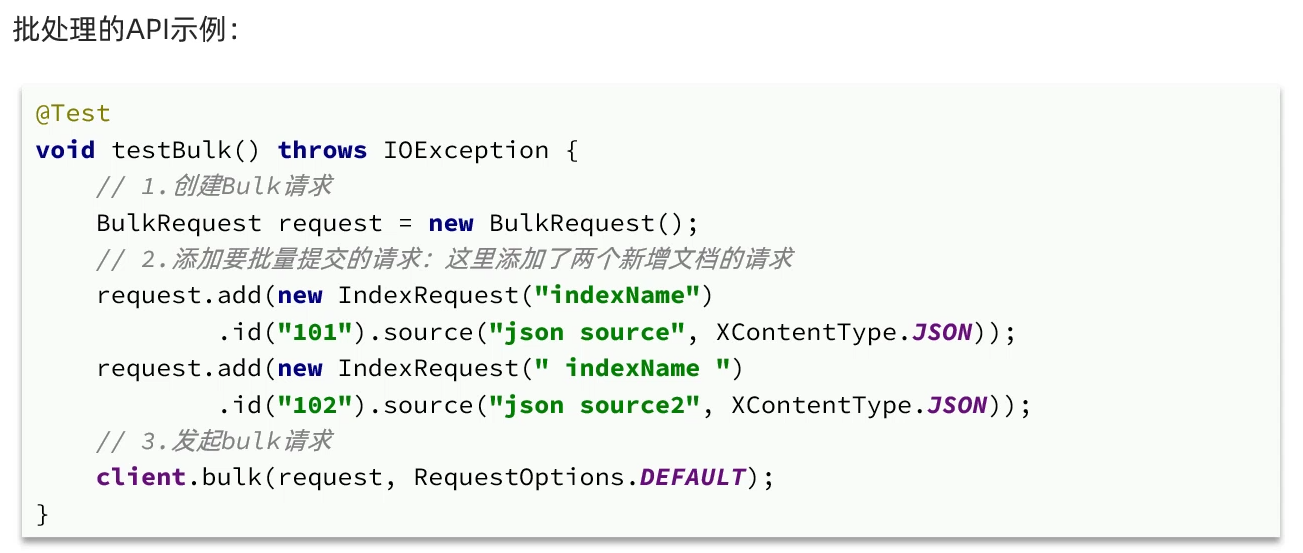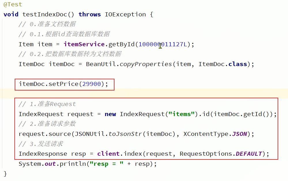 void testLoadItemDocs() throws IOException {// 分页查询商品数据int pageNo = 1;int size = 1000;while (true) {Page<Item> page = itemService.lambdaQuery().eq(Item::getStatus, 1).page(new Page<Item>(pageNo, size));// 非空校验List<Item> items = page.getRecords();if (CollUtils.isEmpty(items)) {return;}log.info("加载第{}页数据,共{}条", pageNo, items.size());// 1.创建RequestBulkRequest request = new BulkRequest("items");// 2.准备参数,添加多个新增的Requestfor (Item item : items) {// 2.1.转换为文档类型ItemDTOItemDoc itemDoc = BeanUtil.copyProperties(item, ItemDoc.class);// 2.2.创建新增文档的Request对象request.add(new IndexRequest().id(itemDoc.getId()).source(JSONUtil.toJsonStr(itemDoc), XContentType.JSON));}// 3.发送请求client.bulk(request, RequestOptions.DEFAULT);// 翻页pageNo++;}
