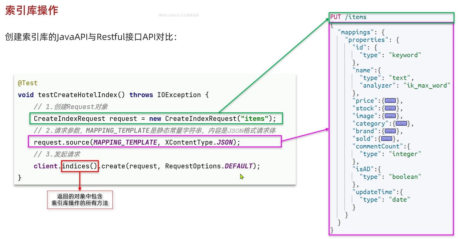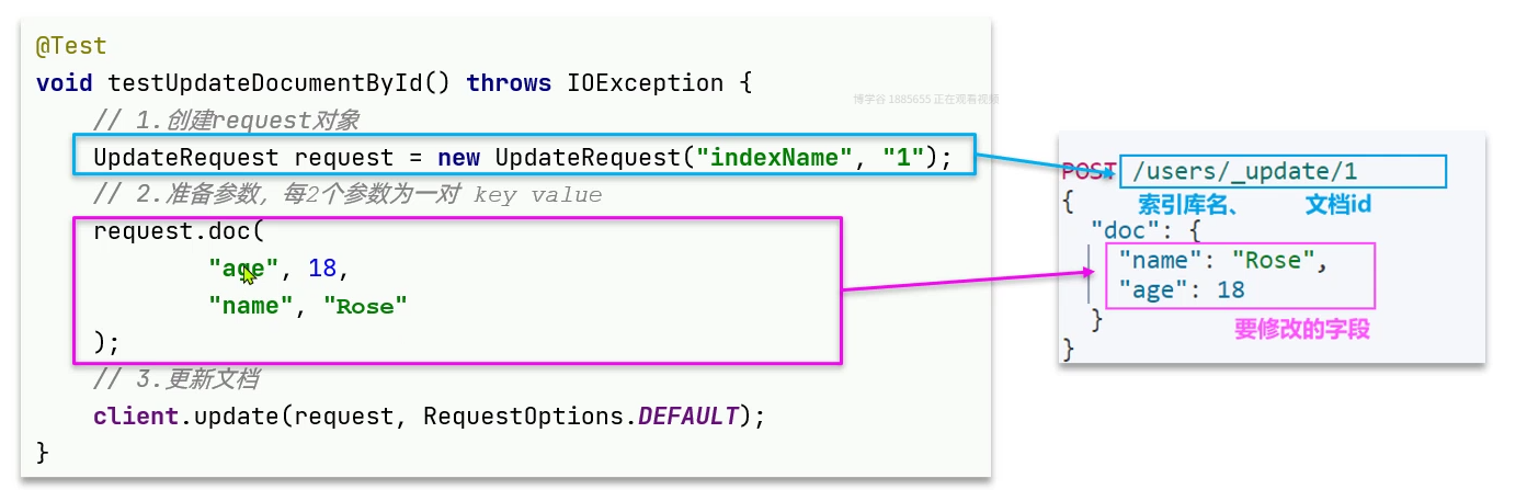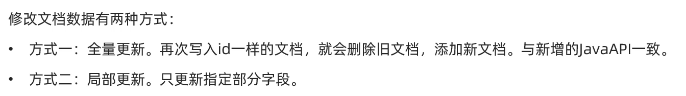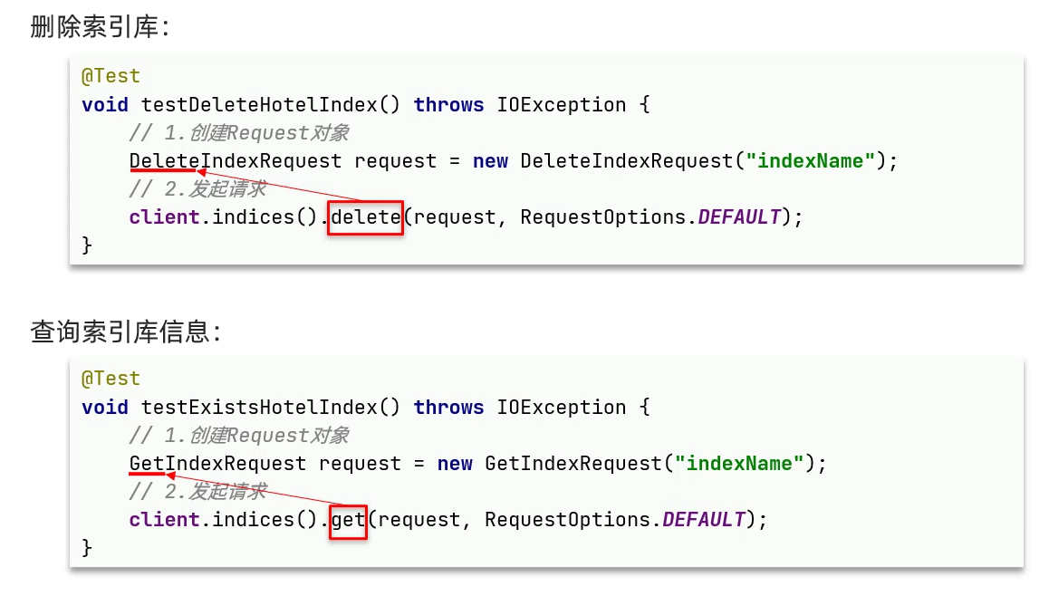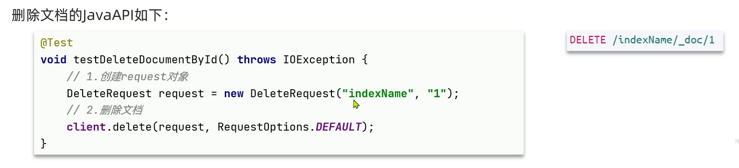void testLoadItemDocs() throws IOException {// 分页查询商品数据int pageNo = 1;int size = 1000;while (true) {Page<Item> page = itemService.lambdaQuery().eq(Item::getStatus, 1).page(new Page<Item>(pageNo, size));// 非空校验List<Item> items = page.getRecords();if (CollUtils.isEmpty(items)) {return;}log.info("加载第{}页数据,共{}条", pageNo, items.size());// 1.创建RequestBulkRequest request = new BulkRequest("items");// 2.准备参数,添加多个新增的Requestfor (Item item : items) {// 2.1.转换为文档类型ItemDTOItemDoc itemDoc = BeanUtil.copyProperties(item, ItemDoc.class);// 2.2.创建新增文档的Request对象request.add(new IndexRequest().id(itemDoc.getId()).source(JSONUtil.toJsonStr(itemDoc), XContentType.JSON));}// 3.发送请求client.bulk(request, RequestOptions.DEFAULT);// 翻页pageNo++;}