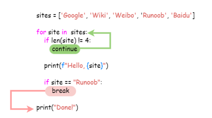在 for 循环中使用 return 语句结束了函数,因此在循环之外的行将不会运行。如果我们使用 break 语句,只有循环会在那时退出,并且最后的 print() 行将运行。
