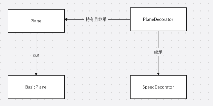 接下来设计装饰器抽象类 PlaneDecorator:它需要继承 Plane 基类(保证与所有飞机有相同的接口,让调用者无需区分是基础飞机还是被装饰的飞机),同时持有一个 Plane 对象(这个对象可以是基础飞机,也可以是被其他装饰器包裹过的飞机,用于保留原始状态)。