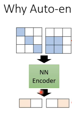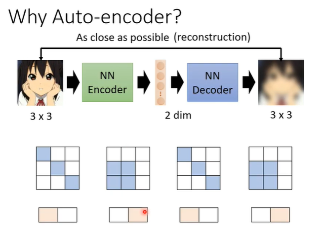 假设一个3x3的图片变为2维的向量,再还原。那么怎么样从9个数值变为2个数值,再还原为9个数值呢?因为对于影像来说不是所有3x3的矩阵都是图片,图片的变化是有限的,虽然图片是3x3但是实际上他的变化可能只有2种类型。