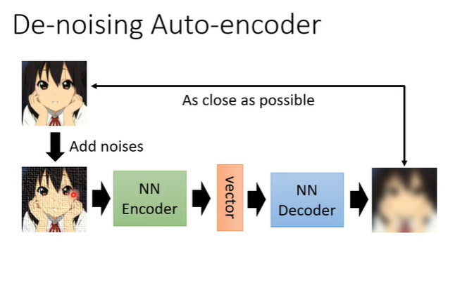 de-nosing auto-encoder是auto-encoder的一个变形,它把原来输入的图片加上一些杂讯,之后一样通过encoder变为向量,再通过decoder把他还原回来,但是要还原的不是encoder的输入而是加入杂讯前的图片。这样就多了一个任务,除了还原图片之外,还需要自己学会如何去除杂讯。