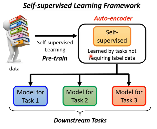 auto-encoder也算是self-supervised learning的一环,简单复习一下self-supervised learning。我们有大量没标注的资料,用这些资料可以训练一个模型(BRET可以做填空题,GPT系列可以预测下一个token),之后可以把这个模型用在下游任务中。在BERT和GPT之前,有一个同样不需要标注资料的任务,就是auto-encoder。