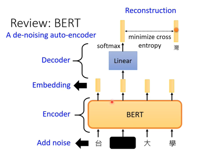 其实今天的BERT也可以看作是de-nosing auto-encoder。输入我们会加mask,那些mask就是noise,BERT的模型就是encoder,输出就是embedding,接下来linear 的模型就是decoder,它要做的就是还原原来的句子,也就是把原来被盖住的部分还原。