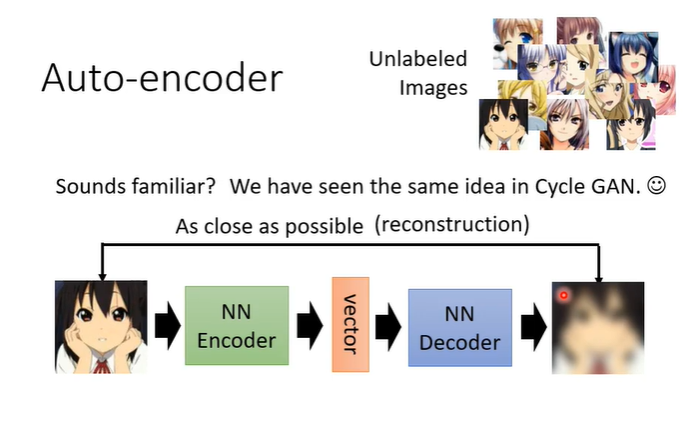 用影像举例,假设有大量的图片在auto-encoder中,在auto-encoder有两个network,一个encoder,一个decoder。encoder将一张图片读进来输出一个向量,即encoder将图片变成一个向量,这个向量再作为decoder的输入,decoder会产生一张图片,训练的目标是encoder的输入与decoder的输出越接近越好。这个概念与cycle GAN有些类似。