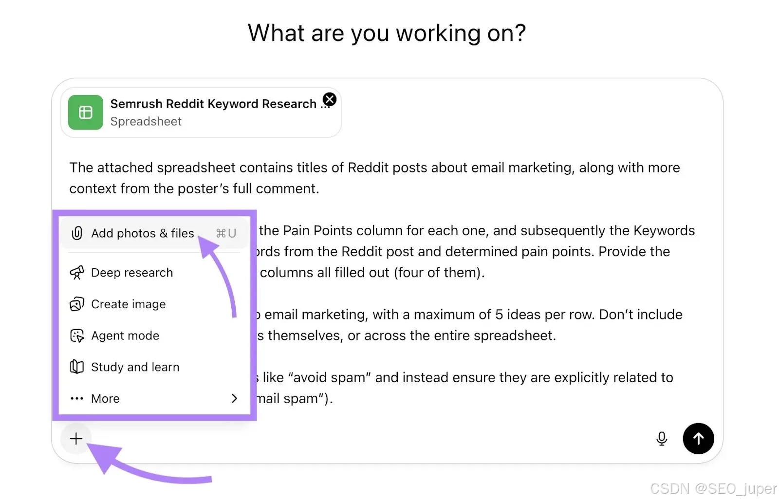接下来,单击“+”图标并选择“添加照片和文件”(或您选择的工具中的等效项)。上传带有 Reddit 主题标题和上下文的原始 CSV。