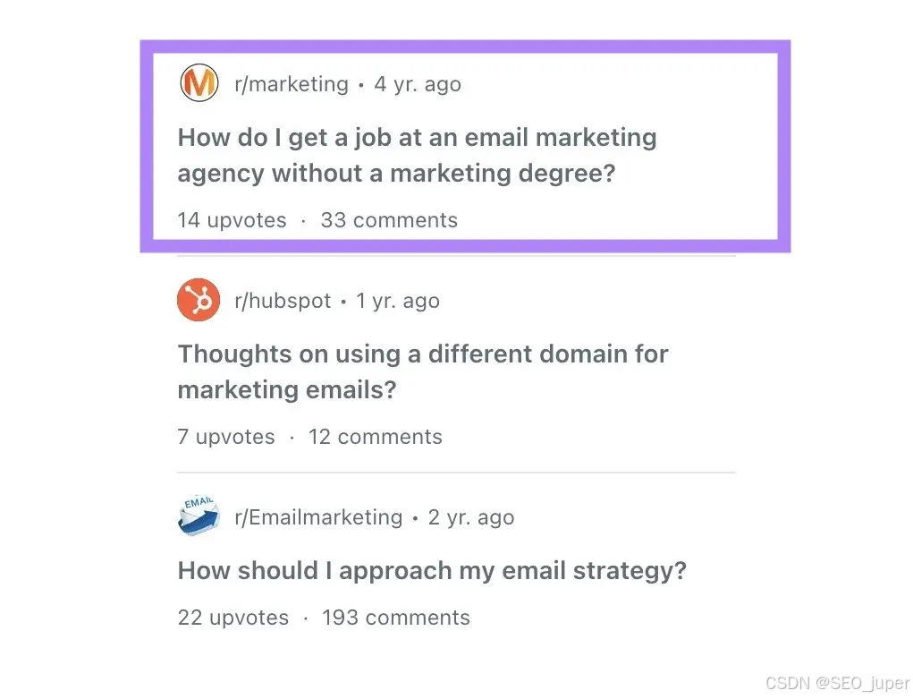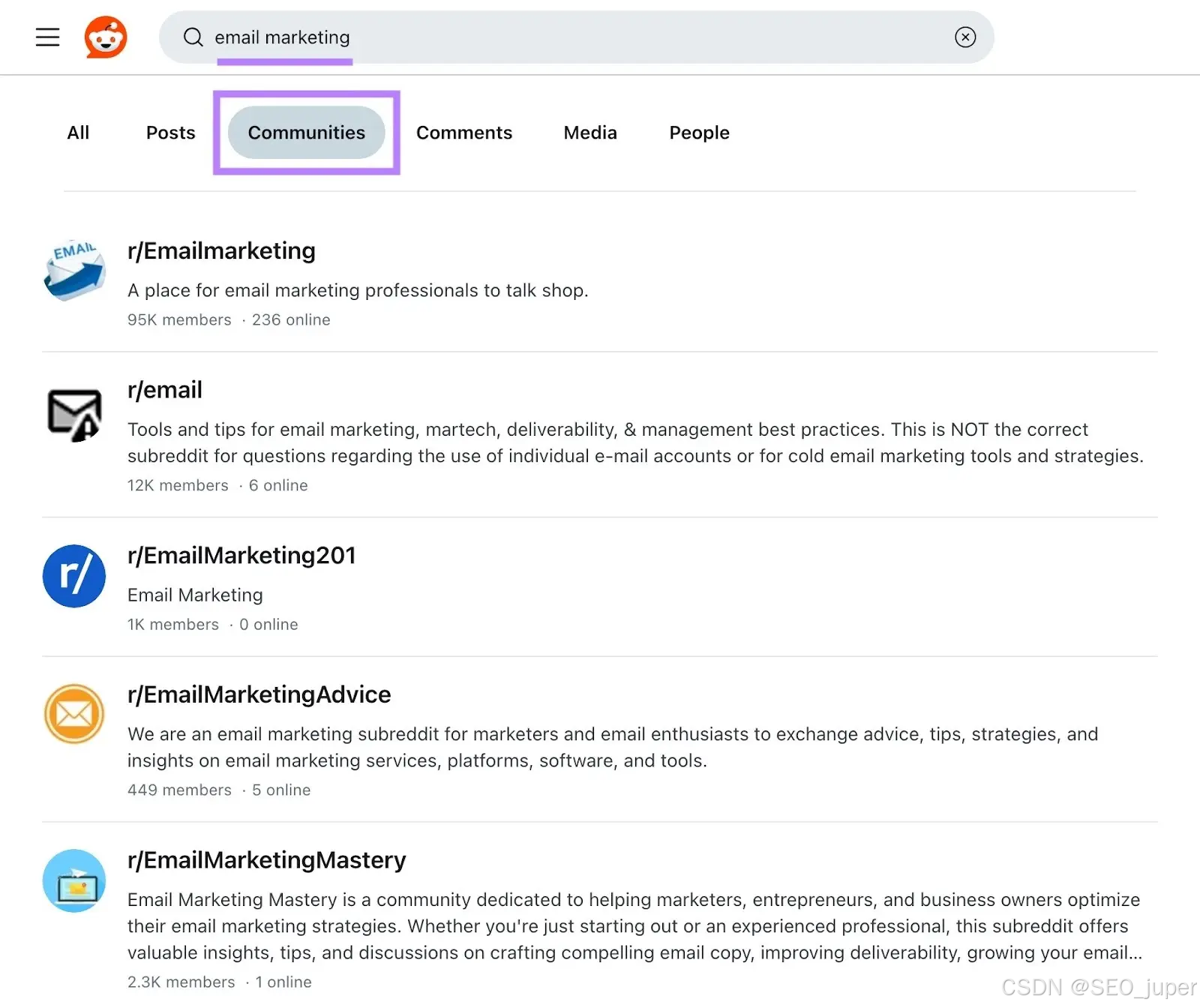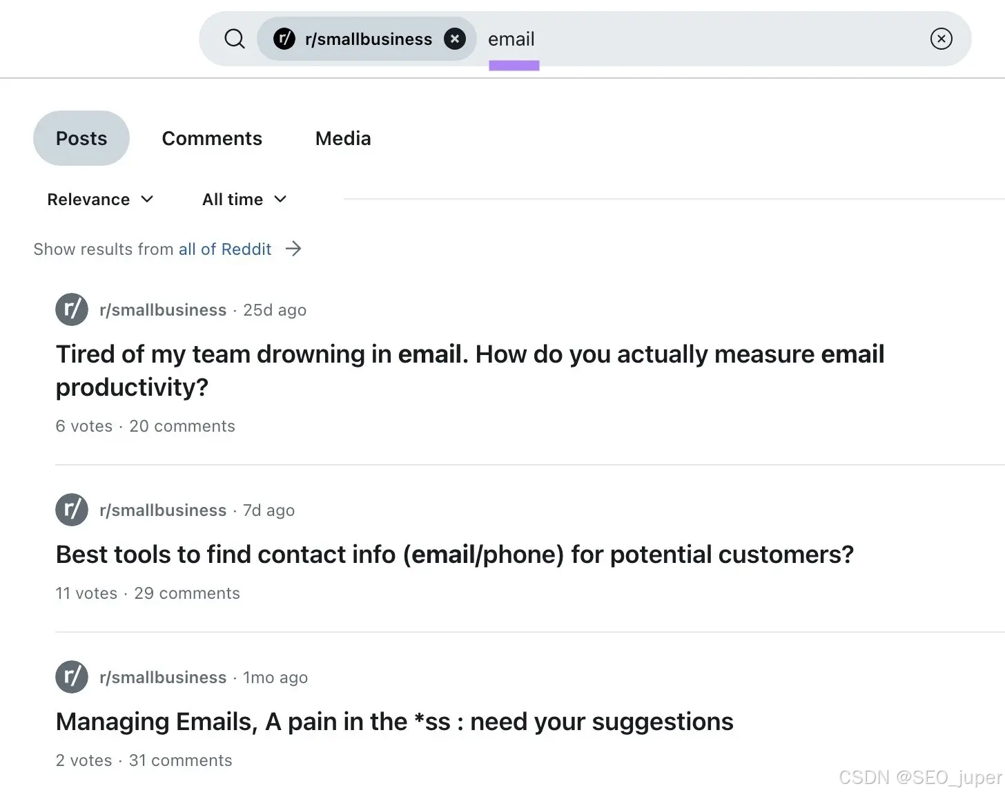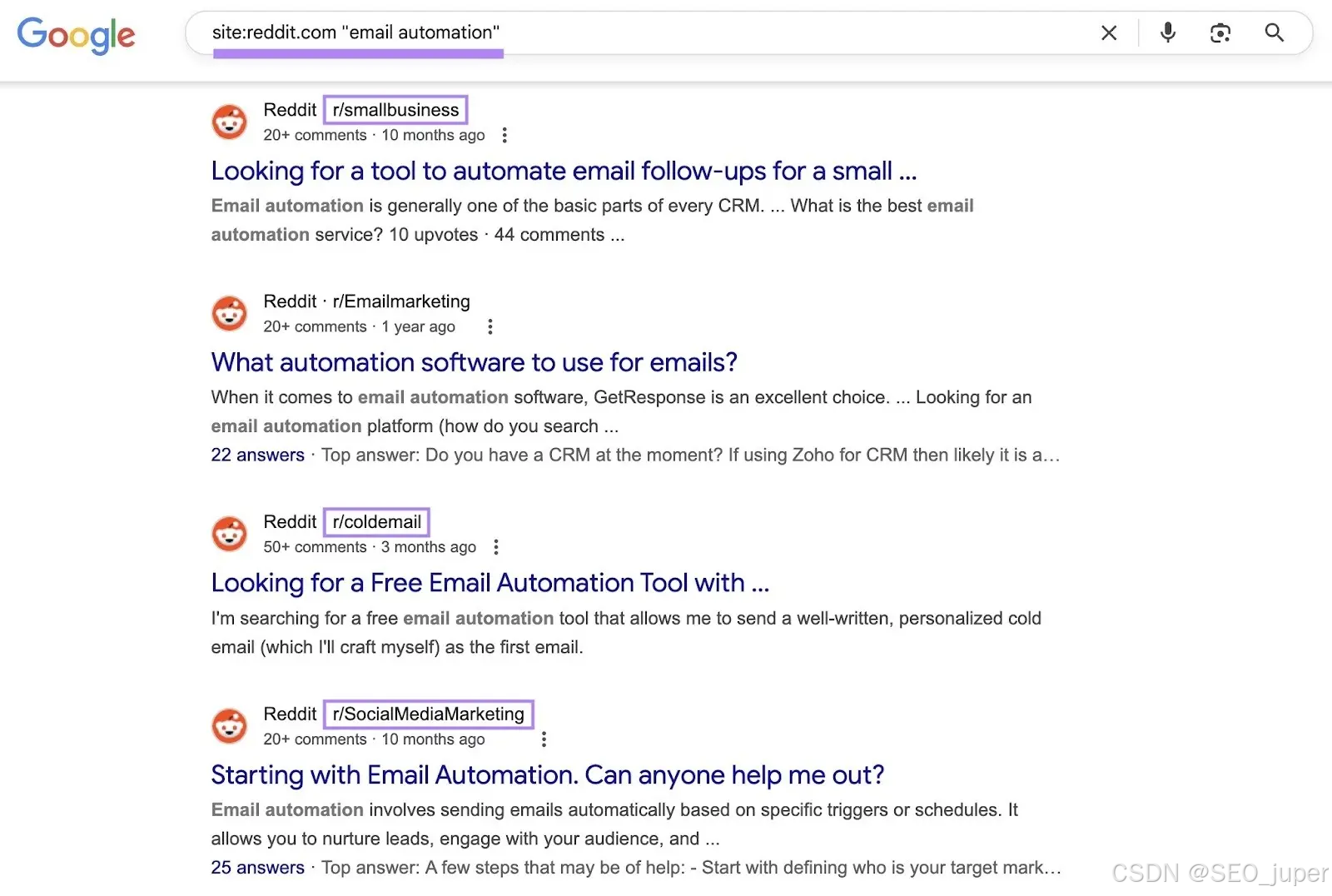 显示的结果不一定是以电子邮件为中心的 Reddit 子版块。但它们仍然是相关关键字的宝贵来源。