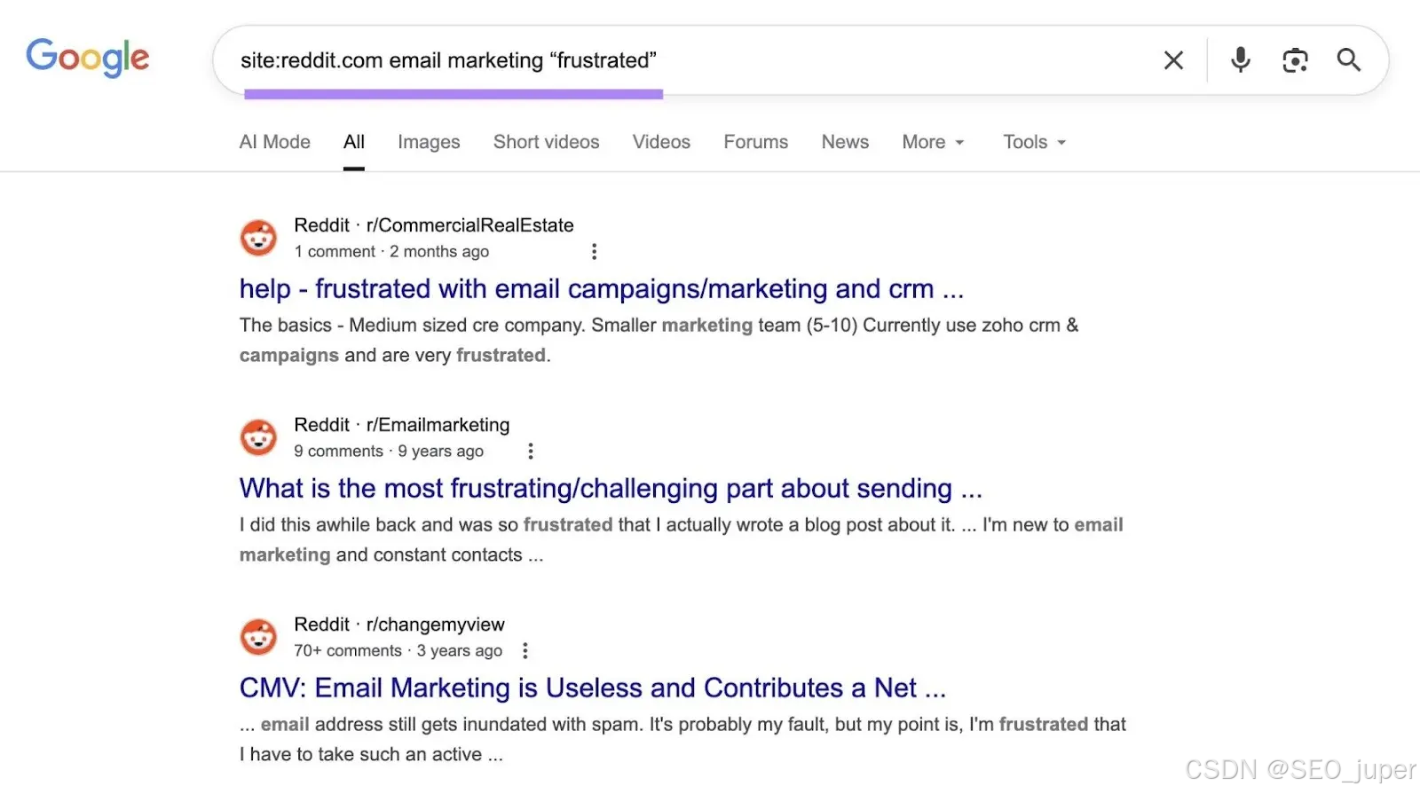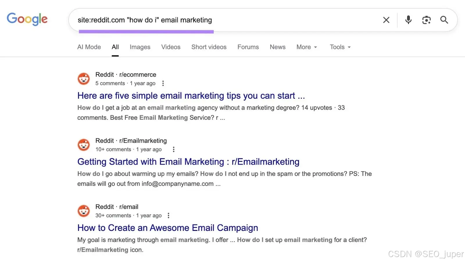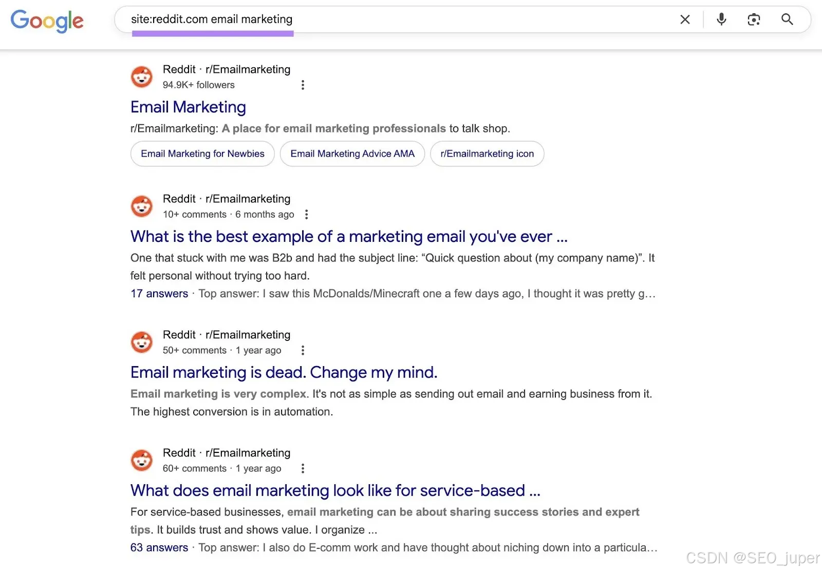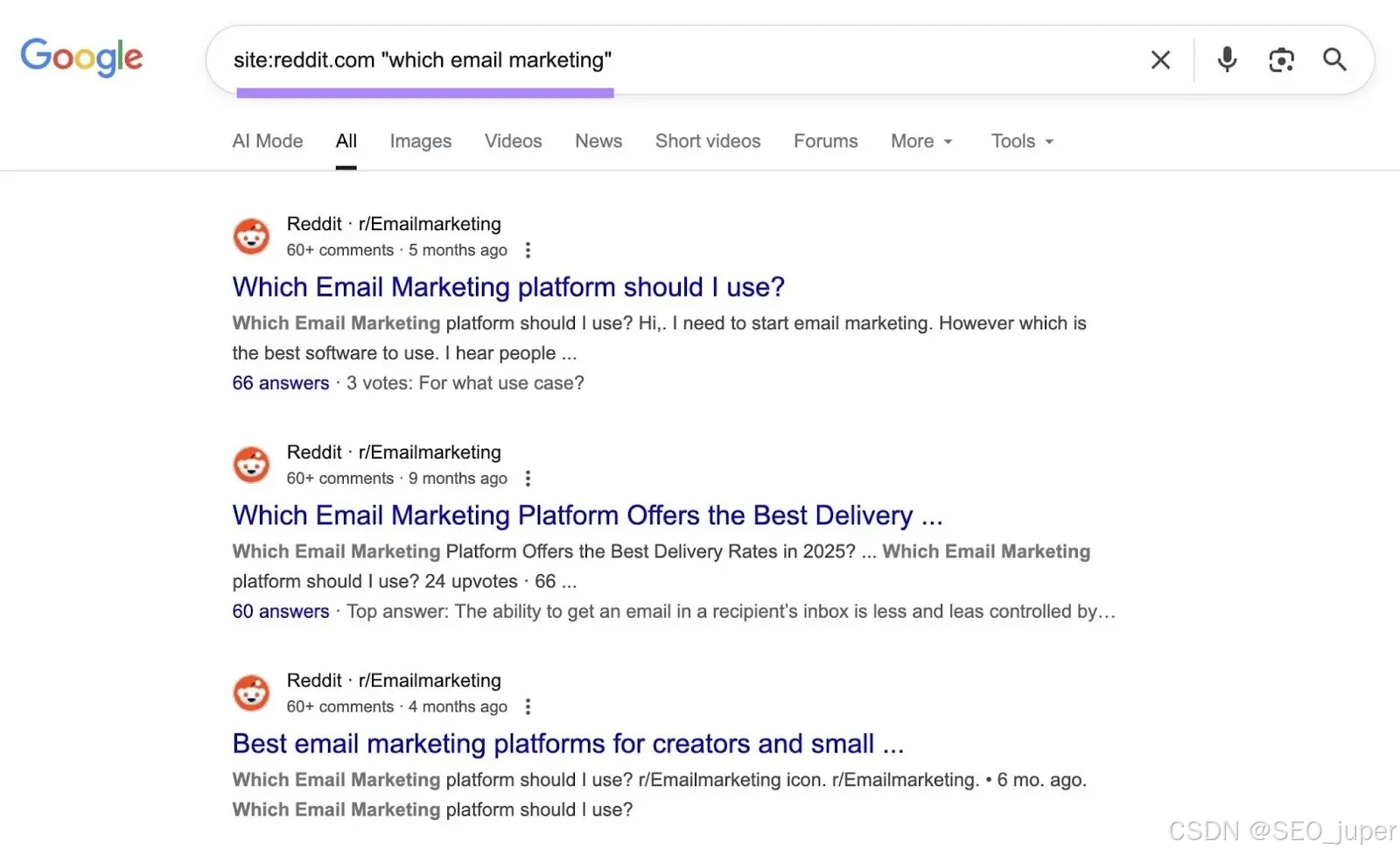 键入“site:reddit.com’哪个电子邮件营销’”以查找包含用引号括起来的特定短语的讨论。