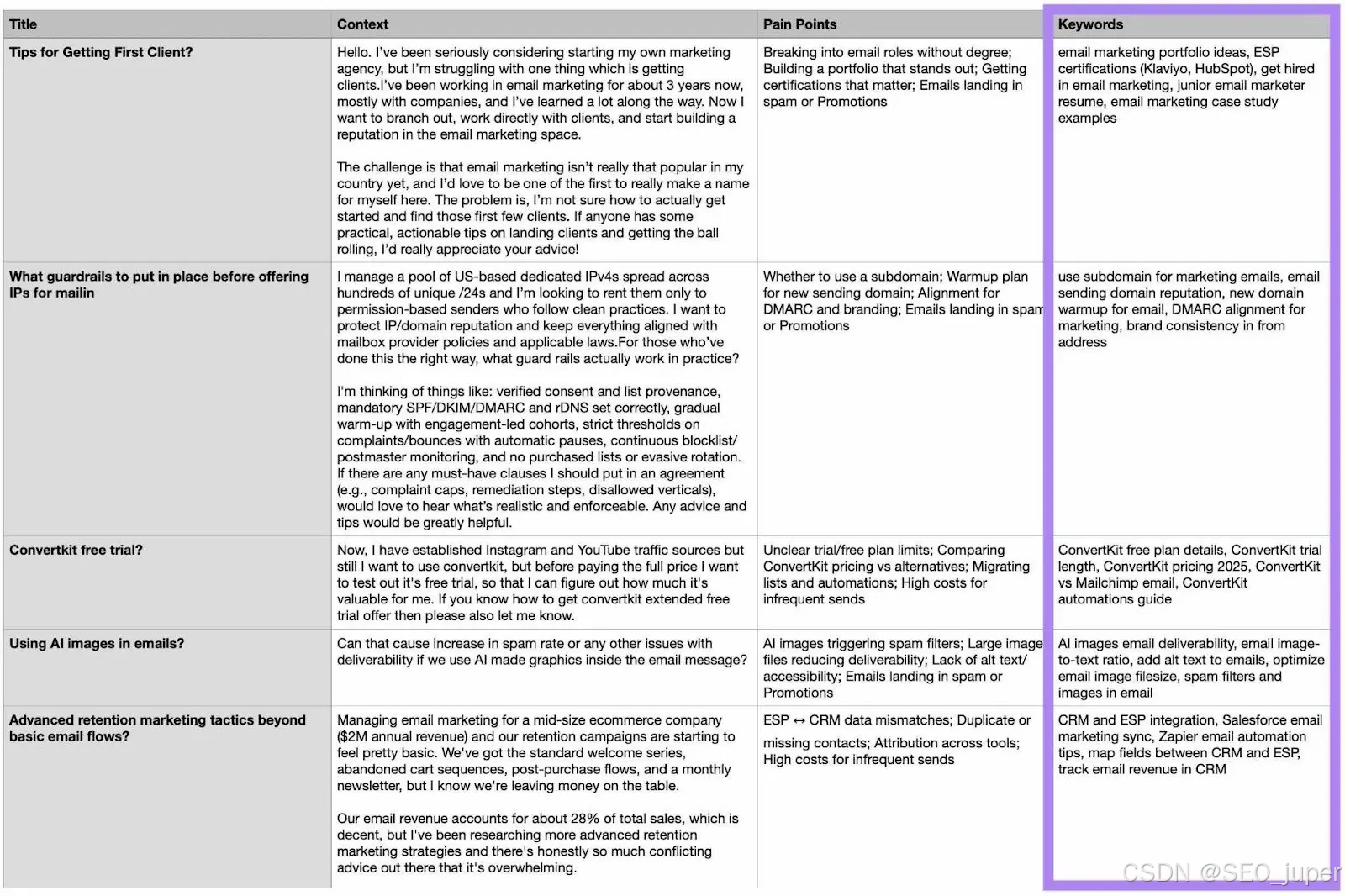 我们已经可以在上面的屏幕截图中看到一些潜在的目标。比如“电子邮件营销是否已死”以及围绕基于服务的企业的电子邮件营销的查询。
