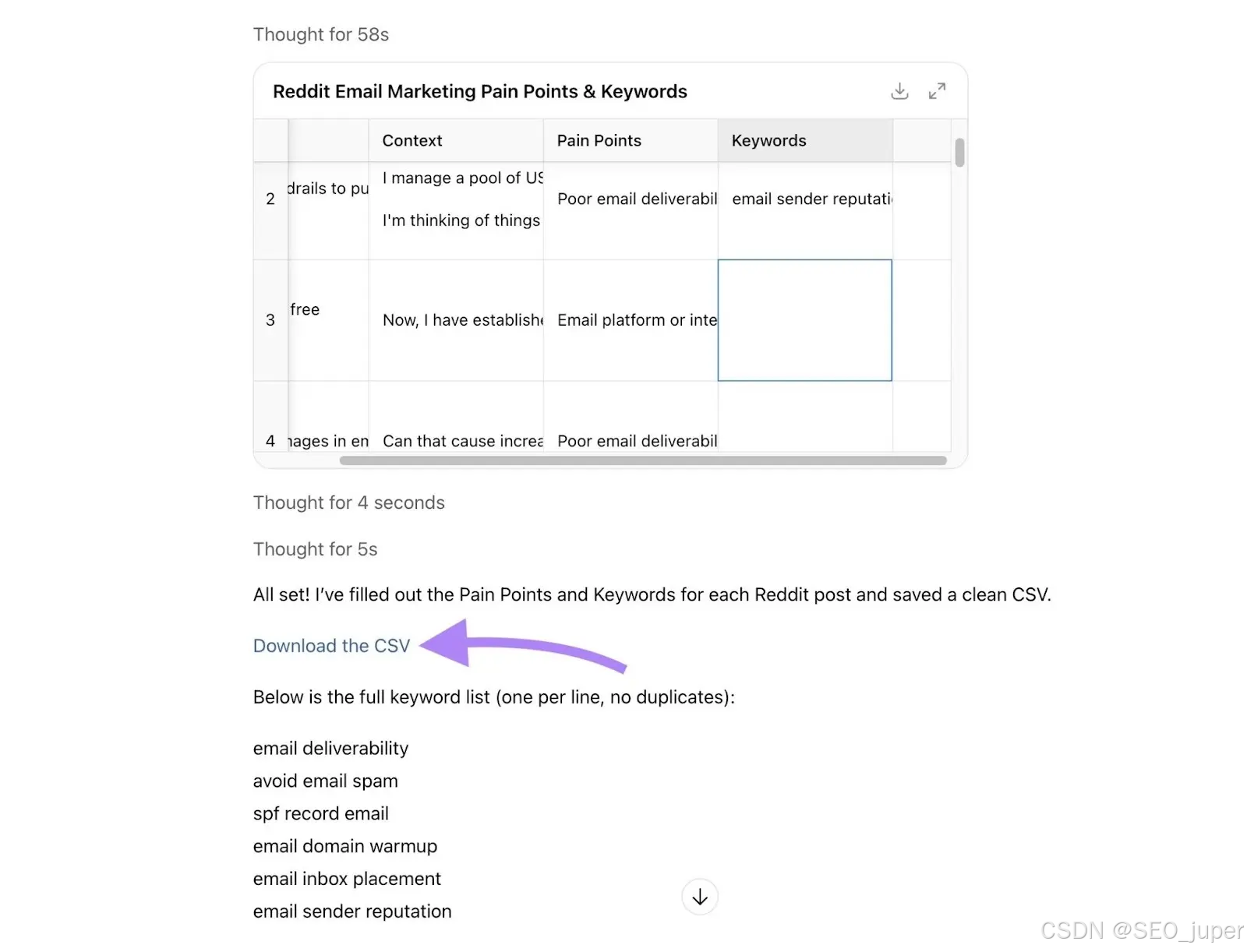 - 我还明确要求该工具生成可下载的 CSV。它通常只会在聊天中返回一张表。