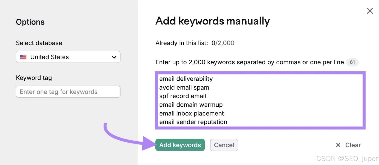 粘贴 AI 工具输出和您在第三步中下载的有机研究报告中的关键字。然后点击“添加关键字”。