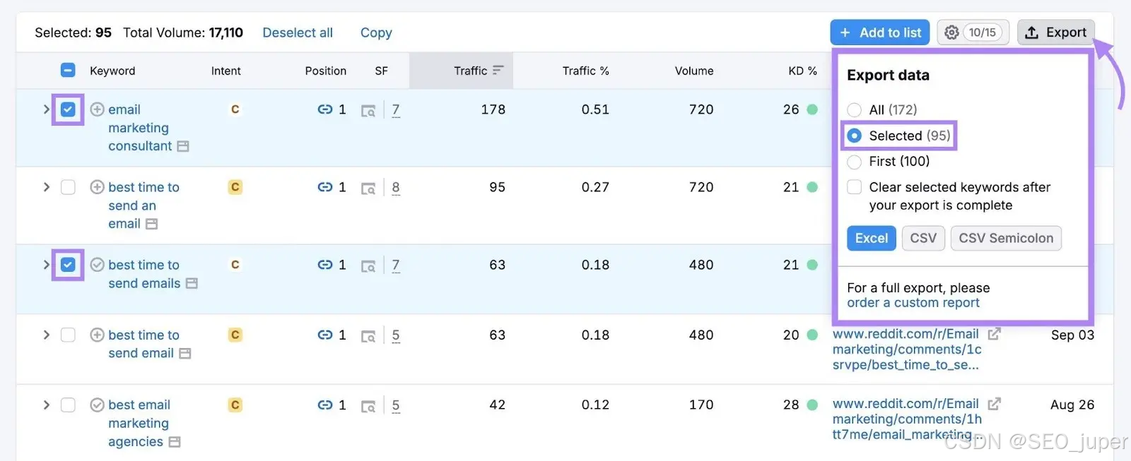浏览您的关键字列表并选择与您的业务相关的所有术语。然后单击“导出”按钮,选择“已选择”,然后单击其中一种格式(我们选择了 CSV)。