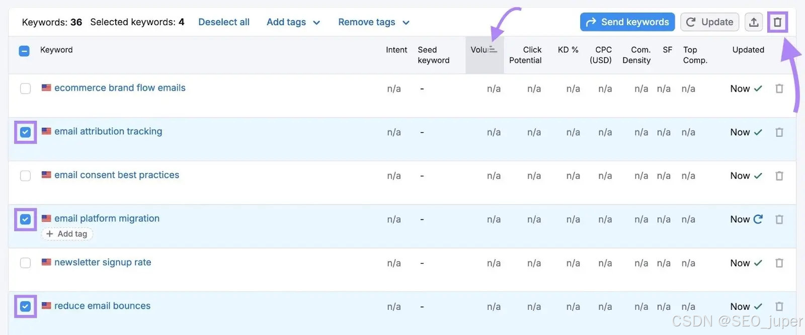 选择您不想使用的任何关键字(例如,讨论您不提供的功能的术语),然后单击右上角的垃圾桶图标以从列表中删除这些关键字。