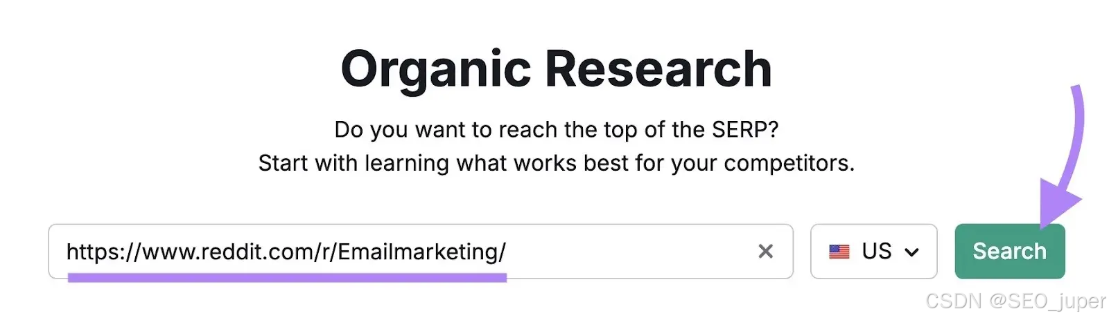 使用 Semrush 的有机研究工具来做到这一点。只需输入 Reddit 子版块 URL,然后单击“搜索”。