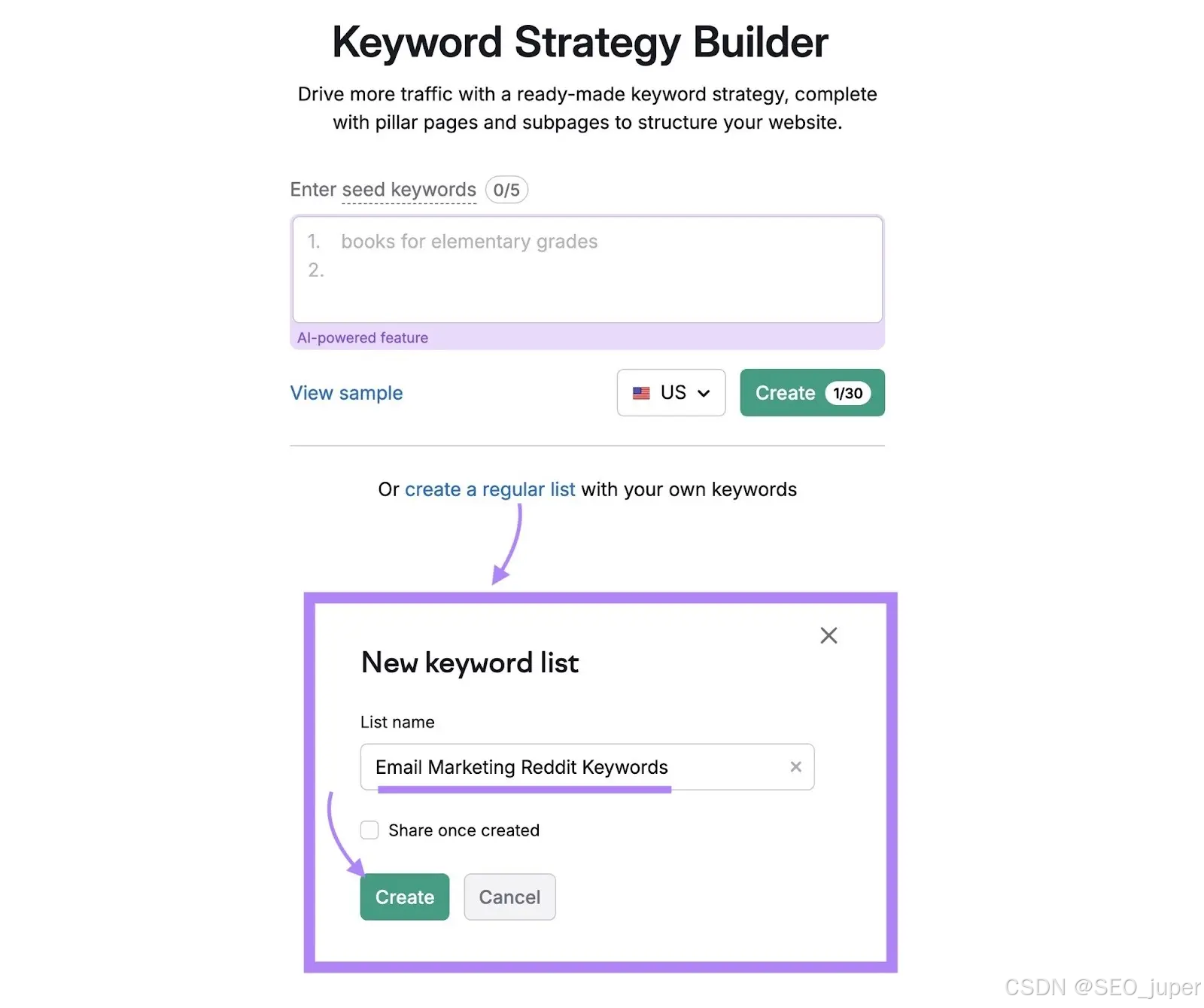 接下来,打开 Semrush 的关键字策略生成器工具并使用它来优化您的关键字列表。选择“创建常规列表”,为您的列表命名,然后单击“创建”。