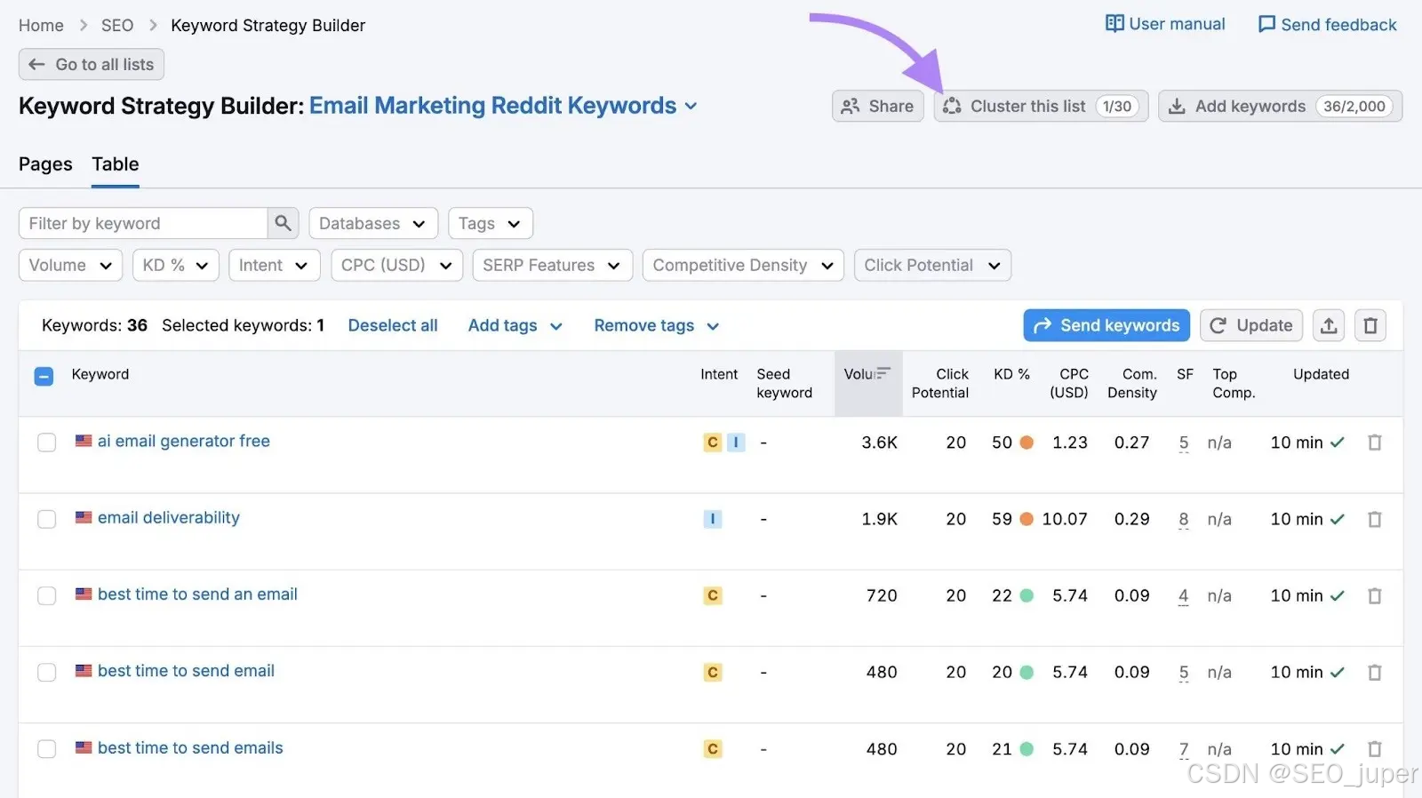 在关键字策略生成器中筛选列表后,单击“对此列表进行聚类”按钮,将所有术语分组到主题相关的聚类中。