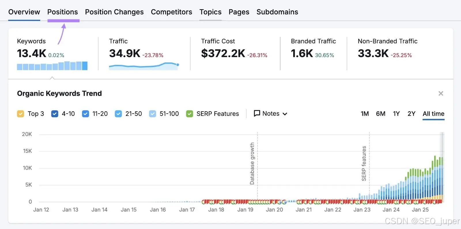 然后转到“位置”选项卡,查看 Reddit 子版块在自然搜索中的表现概览。(确保在屏幕顶部选择“子文件夹”,以确保您看到整个 Reddit 子版块的信息。