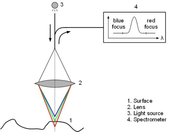 CWL 法测量:使用彩色白光台阶仪,其测量原理基于 CHR 150 N 光学传感器的色差效应。具体过程为:多色光源发出的白光经半透明反射镜后,在色差透镜中发生光谱分离;由于色差效应,不同波长的光会聚焦在不同的 Z 高度上,通过这种 “彩色分离” 就能实现薄膜厚度的测量。