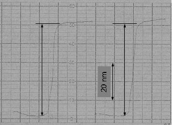 触针式台阶仪测量的标准样品—两层铝膜之间的台阶轮廓。测量时采用最大放大倍率,并对样品进行精确调平,确保台阶占据测量量程的满刻度;此时测量分辨率被认为等于或小于图纸上 1mm 刻度对应的分辨率(约为满量程的 1.6%)。