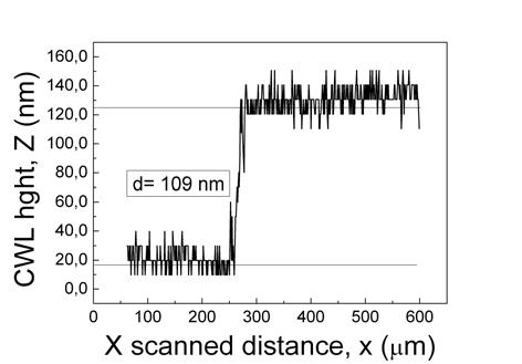 CWL法在1D模式下测量的标准样品—两层铝膜之间形成的典型台阶轮廓。测量前先对样品进行调平,可清晰观察到两层铝膜间的台阶,这为厚度计算提供了基础。实验发现,测量噪声约为设备分辨率的 2-3 倍;在该实验条件下,CWL 技术能成功测量的最小厚度为 49nm,约为设备分辨率的 5 倍。