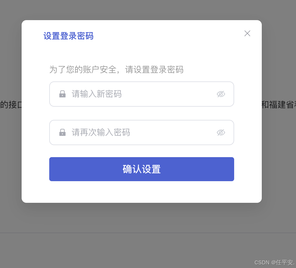 <template><el-dialogv-model="dialogVisible"title="设置登录密码"width="400px"height="400px"align-center:close-on-click-modal="true":close-on-press-escape="true":show-close="true"style="border-radius: 8px"><template #header="{ close, titleId, titleClass }"><div class="my-header"><div class="title">设置登录密码</div></div></template><div class="password-setup-dialog"><div class="description">为了您的账户安全,请设置登录密码</div><el-form ref="formRef" :model="formData" :rules="rules" label-position="top" size="large" class="password-form"><el-form-item prop="password"><el-input v-model="formData.password" :type="showPassword ? 'text' : 'password'" placeholder="请输入新密码" clearable><template #prefix><div class="iconfont icon-mima" style="font-size: 14px"></div></template><template #suffix><el-icon class="password-icon" @click="showPassword = !showPassword"><View v-if="showPassword" /><Hide v-else /></el-icon></template></el-input></el-form-item><el-form-item prop="confirmPassword"><el-input v-model="formData.confirmPassword" :type="showConfirmPassword ? 'text' : 'password'" placeholder="请再次输入密码" clearable><template #prefix><div class="iconfont icon-mima" style="font-size: 14px"></div></template><template #suffix><el-icon class="password-icon" @click="showConfirmPassword = !showConfirmPassword"><View v-if="showConfirmPassword" /><Hide v-else /></el-icon></template></el-input></el-form-item><!-- <div class="password-requirements"><div class="requirement-title">密码要求:</div><ul><li :class="{ 'met': passwordLength }">长度至少8位</li><li :class="{ 'met': hasUpperCase }">包含大写字母</li><li :class="{ 'met': hasLowerCase }">包含小写字母</li><li :class="{ 'met': hasNumber }">包含数字</li><li :class="{ 'met': hasSpecialChar }">包含特殊字符</li></ul></div> --></el-form><div class="dialog-footer"><el-button type="primary" size="large" class="confirm-btn" :loading="loading" @click="handleConfirm"> 确认设置 </el-button></div></div></el-dialog>
