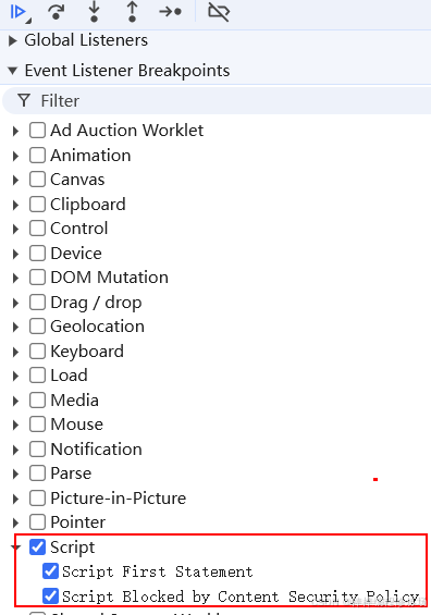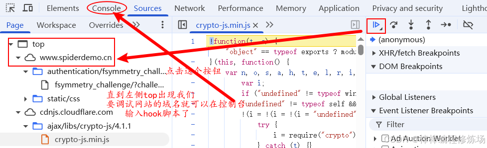 在控制台输入并执行 hook 脚本后,切换到 Sources 面板,先取消之前勾选的 script 脚本断点,然后点击下方按钮继续操作: