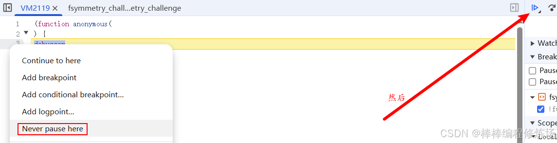 发现这是通过 Function 构造函数直接传入字符串 "debugger" 生成的,这种方式触发的断点可以直接通过选择 "Never pause here 来跳过。回到断点位置后,按以下步骤操作即可: