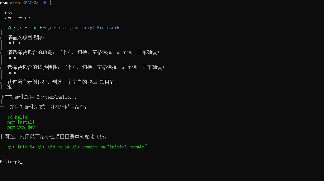 命令执行后,会有很多的项目配置,按提示修改或者直接用默认的也行,大概可以参考以下,具体的可能会因为版本原因有所不同